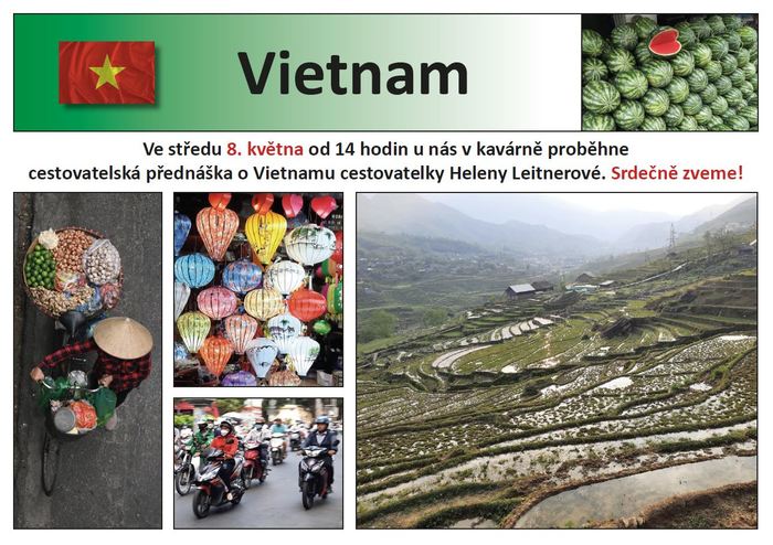 Srdečně zveme na cestovatelskou přednášku oblíbené cestovatelky Heleny Leitnerové tentokrát o Vietnamu, která se uskuteční ve středu 8.5. od 14 hod v naší kavárně.