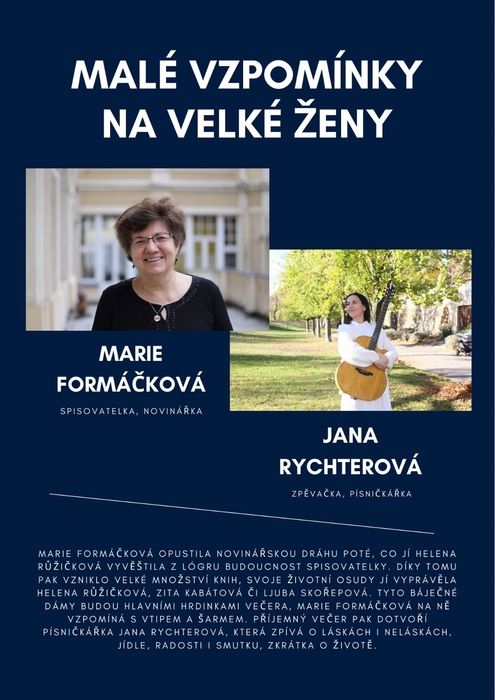 Srdečně vás zveme ve čtvrtek 25.1. ve 14 hod do kavárny na pořad malé vzpomínky na velké ženy s Marií Formáčkovou a písněmi Jany Rychterové.