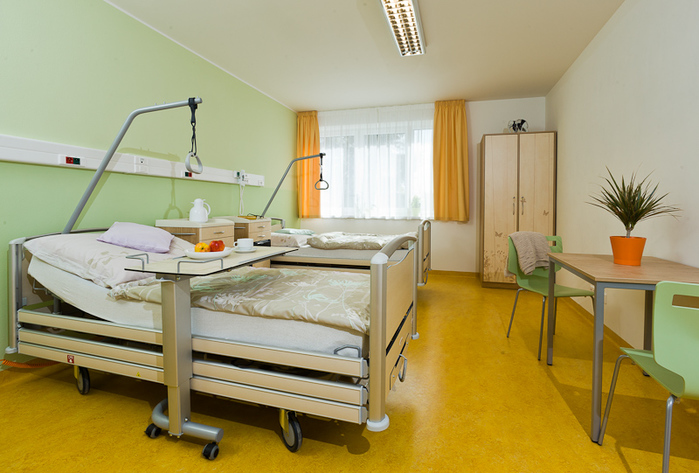 Věšáková stěna s botníkem, odkládací pult se zásuvkou, šatní skříň, elektricky polohovatelné lůžko, noční stolek, komoda, jídelní stůl s 2 židlemi, polička, kuchyňská skříňka, lednice, podlaha – marmoleum.